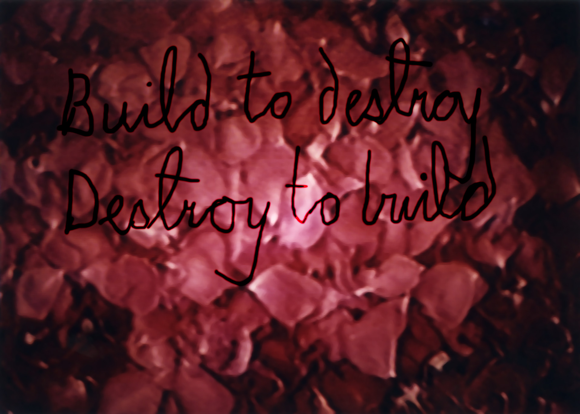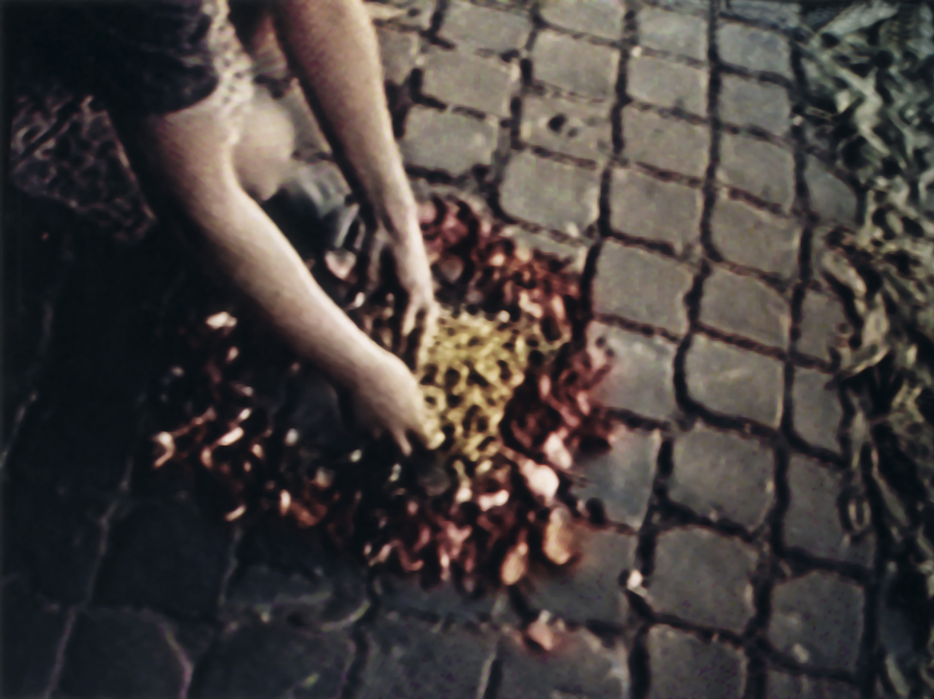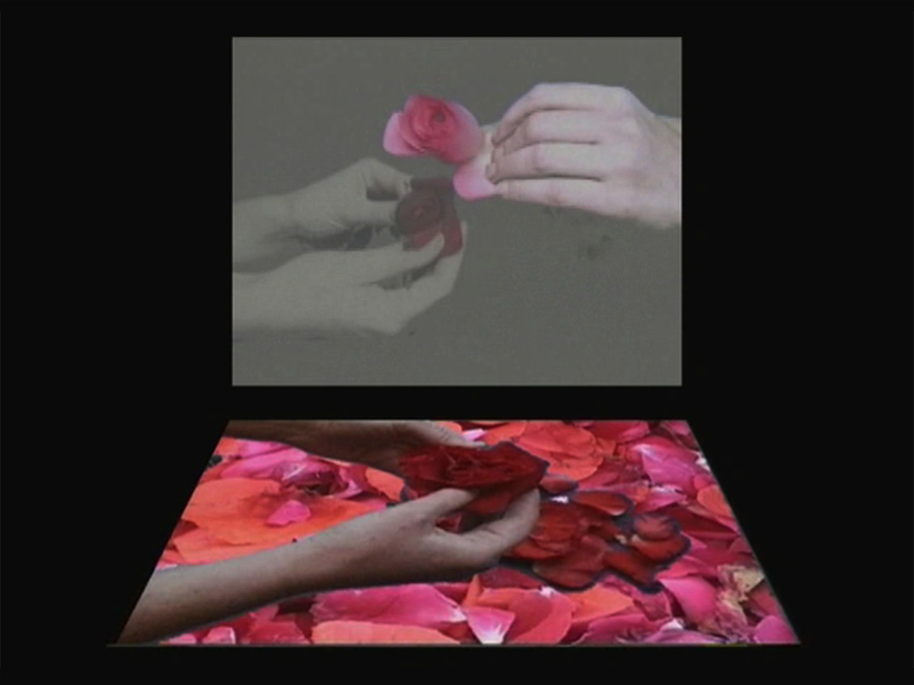 Ceremony of Construction/Destruction takes the religious ritual Corpus Domini as its starting point: During the days of preparation all the flowers in the fields are devastated. Millions of petals are torn off by hundreds of hands, women’s hands, one by one, and than laid out by the same hands in patterns until every paving-stone is covered to decorate the way of the procession to the Mass. Watching the repeated motion for hours and hours, it becomes nearly painful, destructive. In a few minutes the congregation, hundreds of feet, men’s feet walks over the petals so they get destroyed and the patterns are disrupted. The next moment all is swept away. The video projections are accompanied by a sound to intensify the monotony of the movements by the nearly imperceptible over tunes.