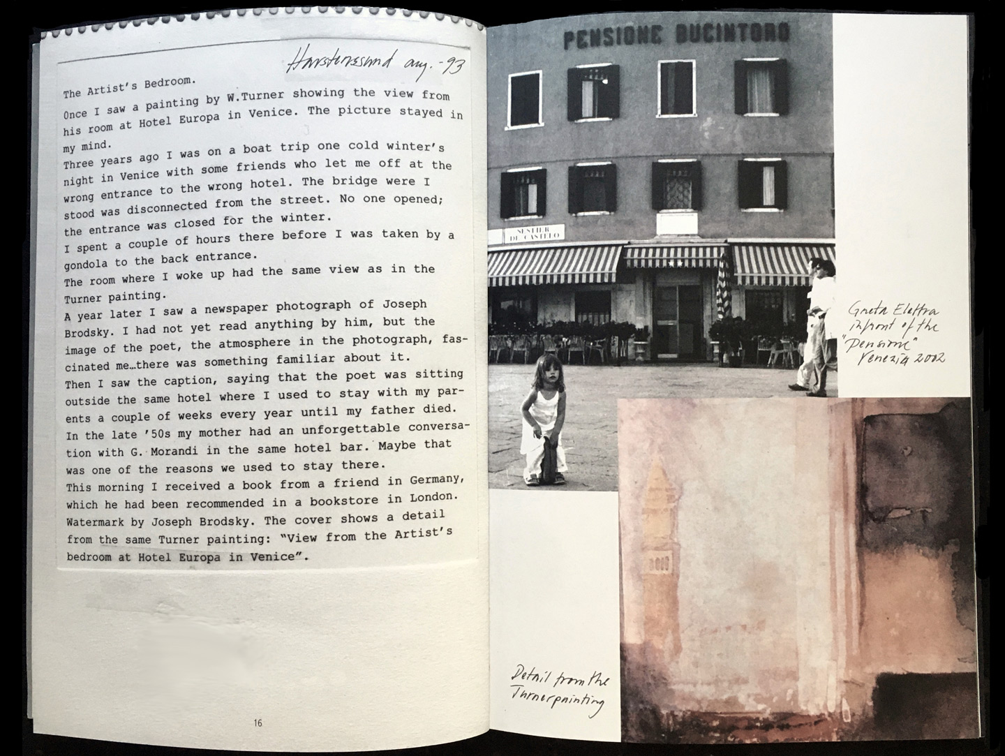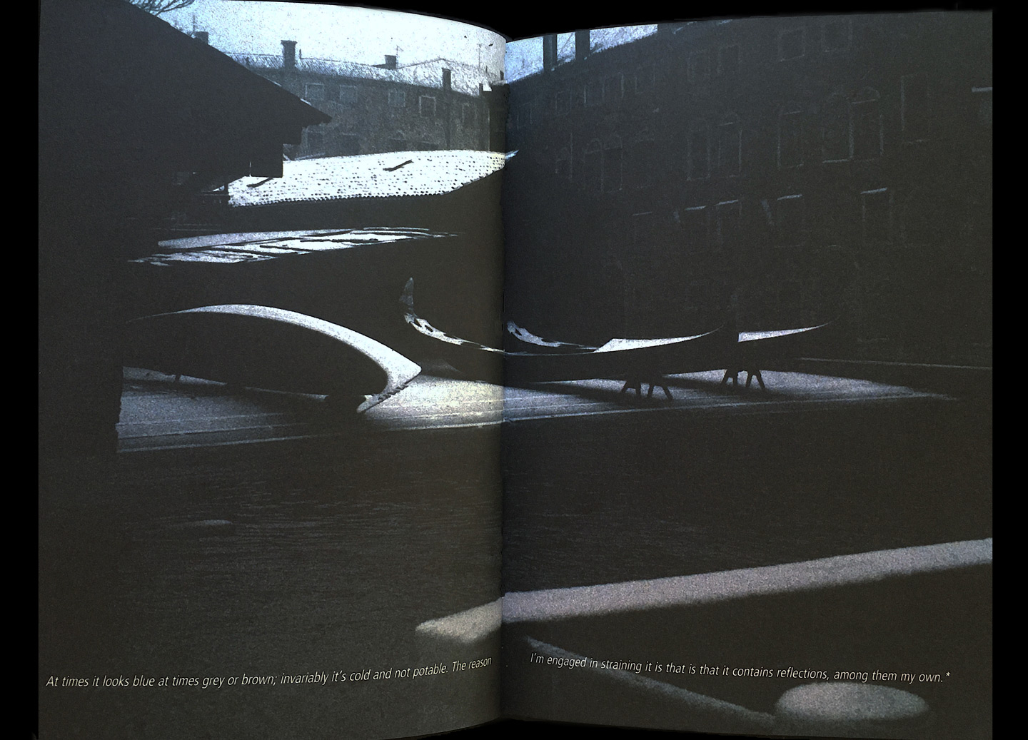 Artist’s book I Published by Holy Dog Production I Page layout by Johan Jenelius I Printed in Italy by Tipolitografia F. Begliomini I Helen Broms SandbergFolds includes images, diary notes and quotations from Joseph Brodsky’s texts and poems. The diary notes are related to or inspired by Brodsky’s texts about time, memory and loss but also by my talks with him in New York, Stockholm and Massachusetts between 1993 and 1995. Joseph Brodsky died in February 1996. Re-reading and re-folding nine years later, I realized that the unfinished work had unconsciously continued inspiring me in doing other projects, that the images where as clear and as powerful as they had appeared the first time that I’ve read Brodsky’s texts, that I wanted to continue the work but there where no more words, that there were no voice to answer my questions, so I gathered the material I had at the time the work was interrupted in a kind of scrapbook. Folds is a fragmented story about the folds of memory, about travelling in time, about travelling irrationally by coincidence, like folding a book where some pages are missing, examining how images and words can interact and interfere.
